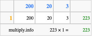Below is an illustration showing you how to calculate 223 times 1 using the box method, using the instructions above.