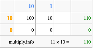 That's all there is to it! As you can see from the box above, the answer to 11 times 10 using the box method is 110.
