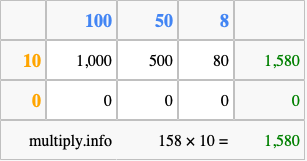 Below is an illustration showing you how to calculate 158 times 10 using the box method, using the instructions above.