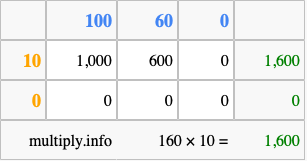 Below is an illustration showing you how to calculate 160 times 10 using the box method, using the instructions above.
