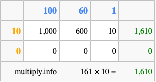 Below is an illustration showing you how to calculate 161 times 10 using the box method, using the instructions above.
