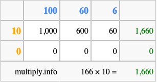 Below is an illustration showing you how to calculate 166 times 10 using the box method, using the instructions above.