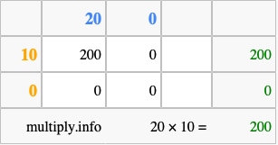 Below is an illustration showing you how to calculate 20 times 10 using the box method, using the instructions above.