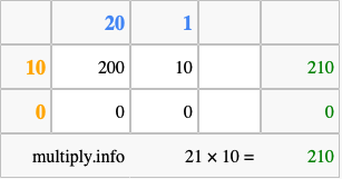 Below is an illustration showing you how to calculate 21 times 10 using the box method, using the instructions above.