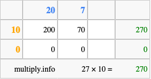Below is an illustration showing you how to calculate 27 times 10 using the box method, using the instructions above.