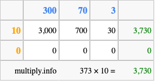 Below is an illustration showing you how to calculate 373 times 10 using the box method, using the instructions above.