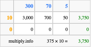 Below is an illustration showing you how to calculate 375 times 10 using the box method, using the instructions above.