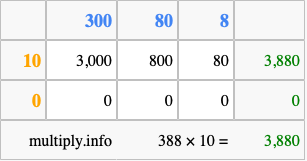 Below is an illustration showing you how to calculate 388 times 10 using the box method, using the instructions above.