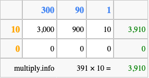 Below is an illustration showing you how to calculate 391 times 10 using the box method, using the instructions above.