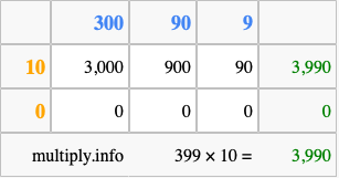 Below is an illustration showing you how to calculate 399 times 10 using the box method, using the instructions above.