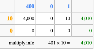 That's all there is to it! As you can see from the box above, the answer to 401 times 10 using the box method is 4,010.