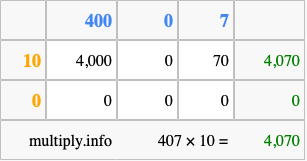 Below is an illustration showing you how to calculate 407 times 10 using the box method, using the instructions above.
