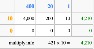 Below is an illustration showing you how to calculate 421 times 10 using the box method, using the instructions above.