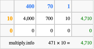 Below is an illustration showing you how to calculate 471 times 10 using the box method, using the instructions above.