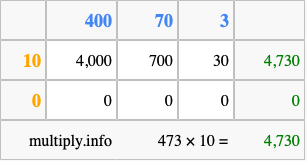 Below is an illustration showing you how to calculate 473 times 10 using the box method, using the instructions above.