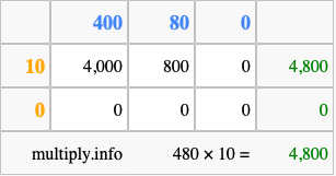 Below is an illustration showing you how to calculate 480 times 10 using the box method, using the instructions above.