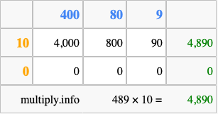 Below is an illustration showing you how to calculate 489 times 10 using the box method, using the instructions above.