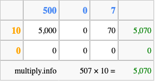 Below is an illustration showing you how to calculate 507 times 10 using the box method, using the instructions above.