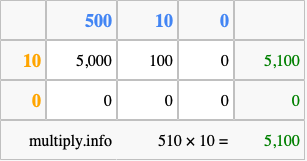 Below is an illustration showing you how to calculate 510 times 10 using the box method, using the instructions above.