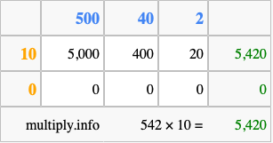 Below is an illustration showing you how to calculate 542 times 10 using the box method, using the instructions above.