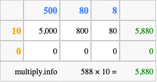 Below is an illustration showing you how to calculate 588 times 10 using the box method, using the instructions above.