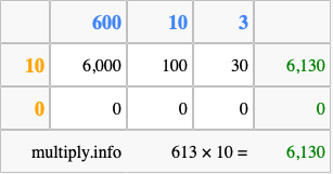 Below is an illustration showing you how to calculate 613 times 10 using the box method, using the instructions above.