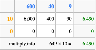 Below is an illustration showing you how to calculate 649 times 10 using the box method, using the instructions above.