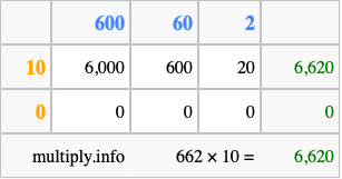 Below is an illustration showing you how to calculate 662 times 10 using the box method, using the instructions above.