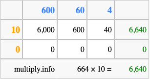 Below is an illustration showing you how to calculate 664 times 10 using the box method, using the instructions above.
