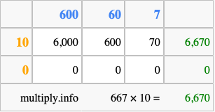 Below is an illustration showing you how to calculate 667 times 10 using the box method, using the instructions above.