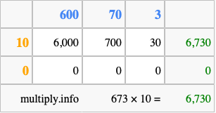 Below is an illustration showing you how to calculate 673 times 10 using the box method, using the instructions above.