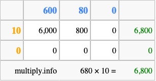 Below is an illustration showing you how to calculate 680 times 10 using the box method, using the instructions above.