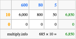 Below is an illustration showing you how to calculate 685 times 10 using the box method, using the instructions above.