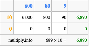 Below is an illustration showing you how to calculate 689 times 10 using the box method, using the instructions above.