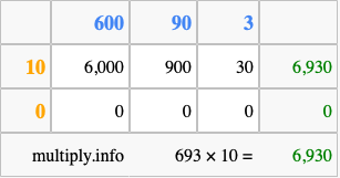 Below is an illustration showing you how to calculate 693 times 10 using the box method, using the instructions above.