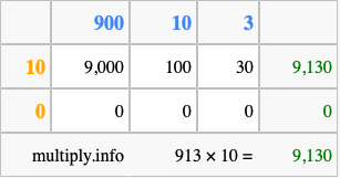 Below is an illustration showing you how to calculate 913 times 10 using the box method, using the instructions above.