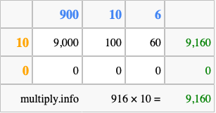 Below is an illustration showing you how to calculate 916 times 10 using the box method, using the instructions above.