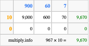 Below is an illustration showing you how to calculate 967 times 10 using the box method, using the instructions above.