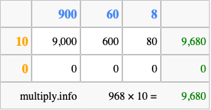 Below is an illustration showing you how to calculate 968 times 10 using the box method, using the instructions above.