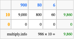 Below is an illustration showing you how to calculate 986 times 10 using the box method, using the instructions above.