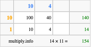 That's all there is to it! As you can see from the box above, the answer to 14 times 11 using the box method is 154.