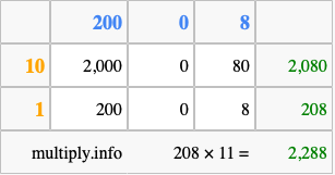 Below is an illustration showing you how to calculate 208 times 11 using the box method, using the instructions above.