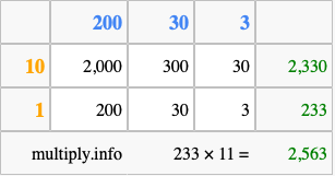 That's all there is to it! As you can see from the box above, the answer to 233 times 11 using the box method is 2,563.