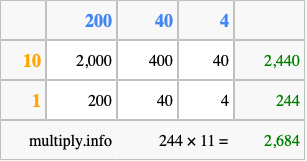 Below is an illustration showing you how to calculate 244 times 11 using the box method, using the instructions above.
