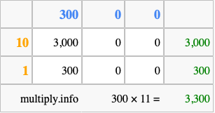 That's all there is to it! As you can see from the box above, the answer to 300 times 11 using the box method is 3,300.