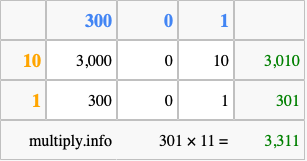 Below is an illustration showing you how to calculate 301 times 11 using the box method, using the instructions above.