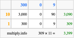 That's all there is to it! As you can see from the box above, the answer to 309 times 11 using the box method is 3,399.