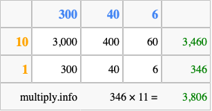 Below is an illustration showing you how to calculate 346 times 11 using the box method, using the instructions above.