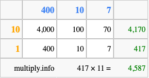 That's all there is to it! As you can see from the box above, the answer to 417 times 11 using the box method is 4,587.