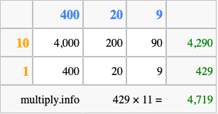 That's all there is to it! As you can see from the box above, the answer to 429 times 11 using the box method is 4,719.